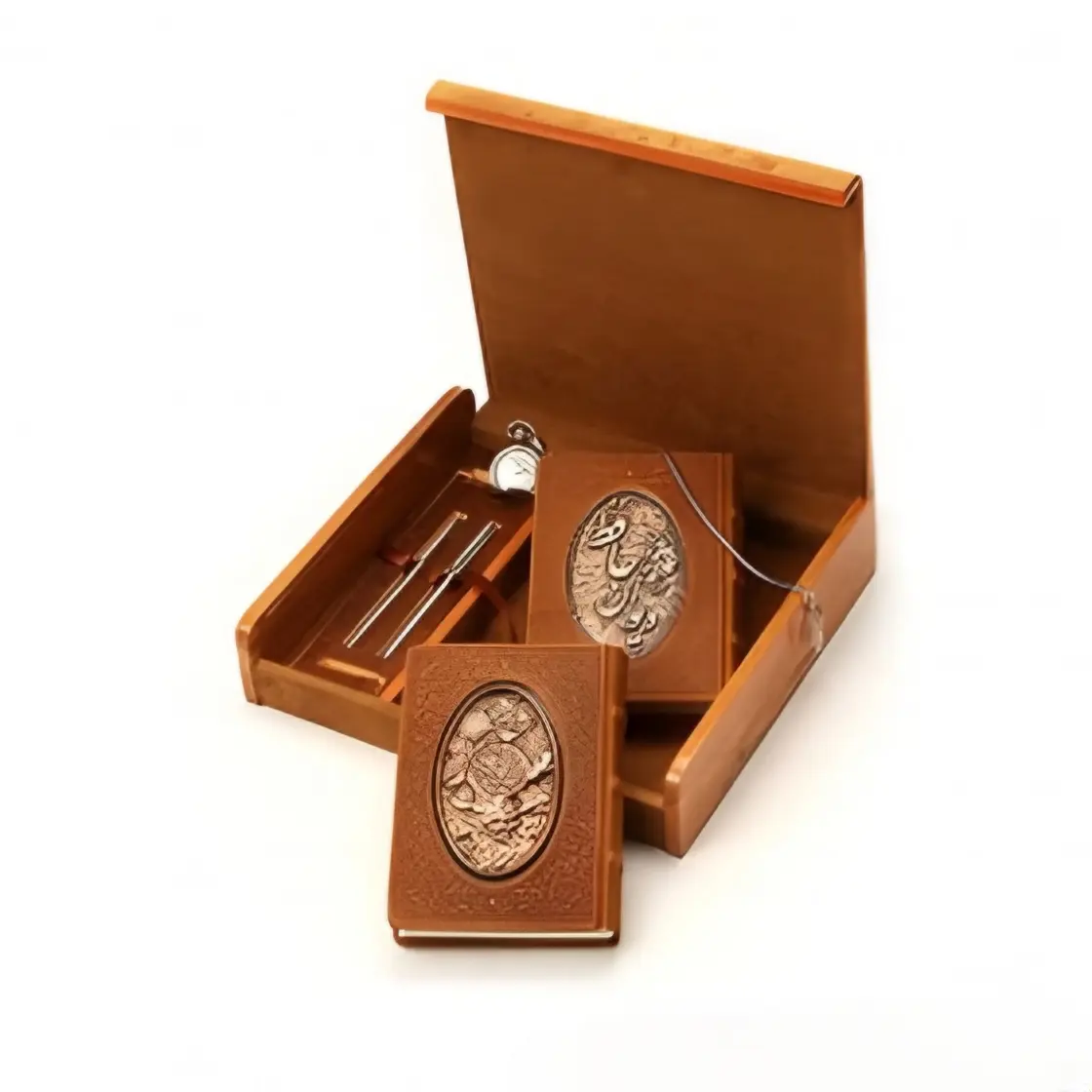 اگر به دنبال هدیهای ارزشمند، ماندگار و اصیل هستید، ست نفیس قرآن کریم و دیوان حافظ بهترین انتخاب شماست. این مجموعه زیبا، با چاپی نفیس، جلد چرمی فاخر و طراحی سنتی چشمنواز، ترکیبی است از معنویت، عشق و زیبایی ایرانی.